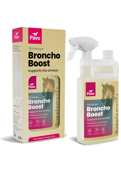 Pavo BronchoBoost is an innovative supplement with an optimal combination of effective essential oils. These oils soothe the airways and throat, help keep the throat clear, and support easier breathing. What makes Pavo BronchoBoost unique is its method of use: as usual, you can mix the liquid with the daily feed, but in addition, Pavo BronchoBoost can also be sprayed over the roughage. This way, your horse not only ingests the supplement so it can work from the inside, but also inhales it at the same time for optimal effect.