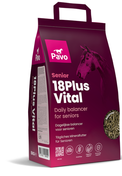 Pavo 18Plus Vital voorziet oudere paarden van alle noodzakelijke vitaminen, mineralen en sporenelementen, zonder extra calorieën toe te voegen. Ideaal voor senioren die snel te zwaar worden. Het suiker- en zetmeelgehalte is zeer laag en het product is volledig vrij van granen en toegevoegde suikers. De unieke senioren-premix bevat extra vitaminen en een hoge dosering antioxidanten, die helpen om je paard gezond ouder te laten worden. Pavo 18Plus Vital is geschikt voor paarden met uiteenlopende gebitscondities en kan zowel droog als geweekt gevoerd worden.